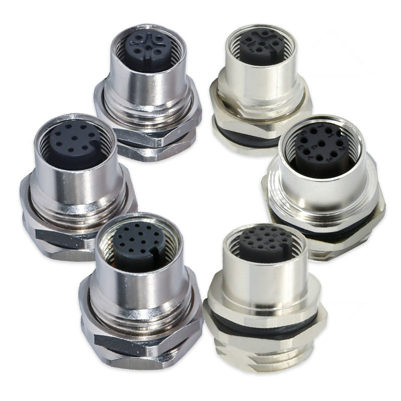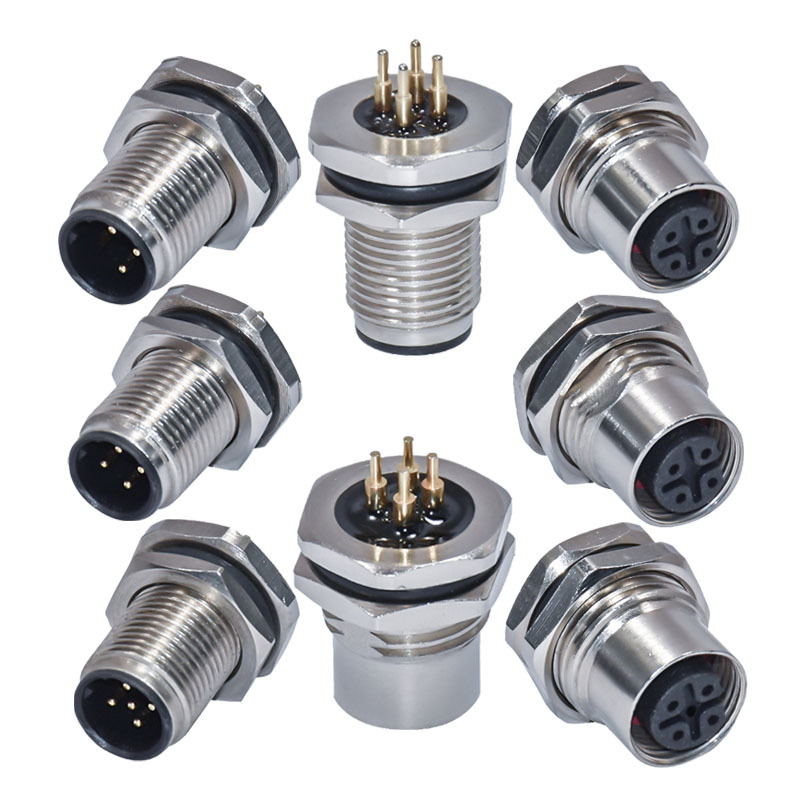 Hoogwaardige M12 connector met 90-graden configuratie, beschikbaar in meerdere pin configuraties (3, 4, 5, 8, 12, 17 pinnen) voor PCB sensor toepassingen. Geschikt voor zowel mannelijke als vrouwelijke aansluitingen in automotive en industriële omgevingen.